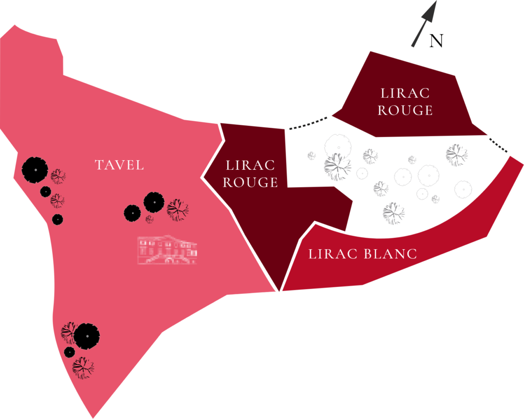 From the Château’s terrace nearly 100 hectares stretch as far as the eye can see. Two thirds are vineyards in the Tavel and Lirac appellations and the remainder is woodland and garrique.